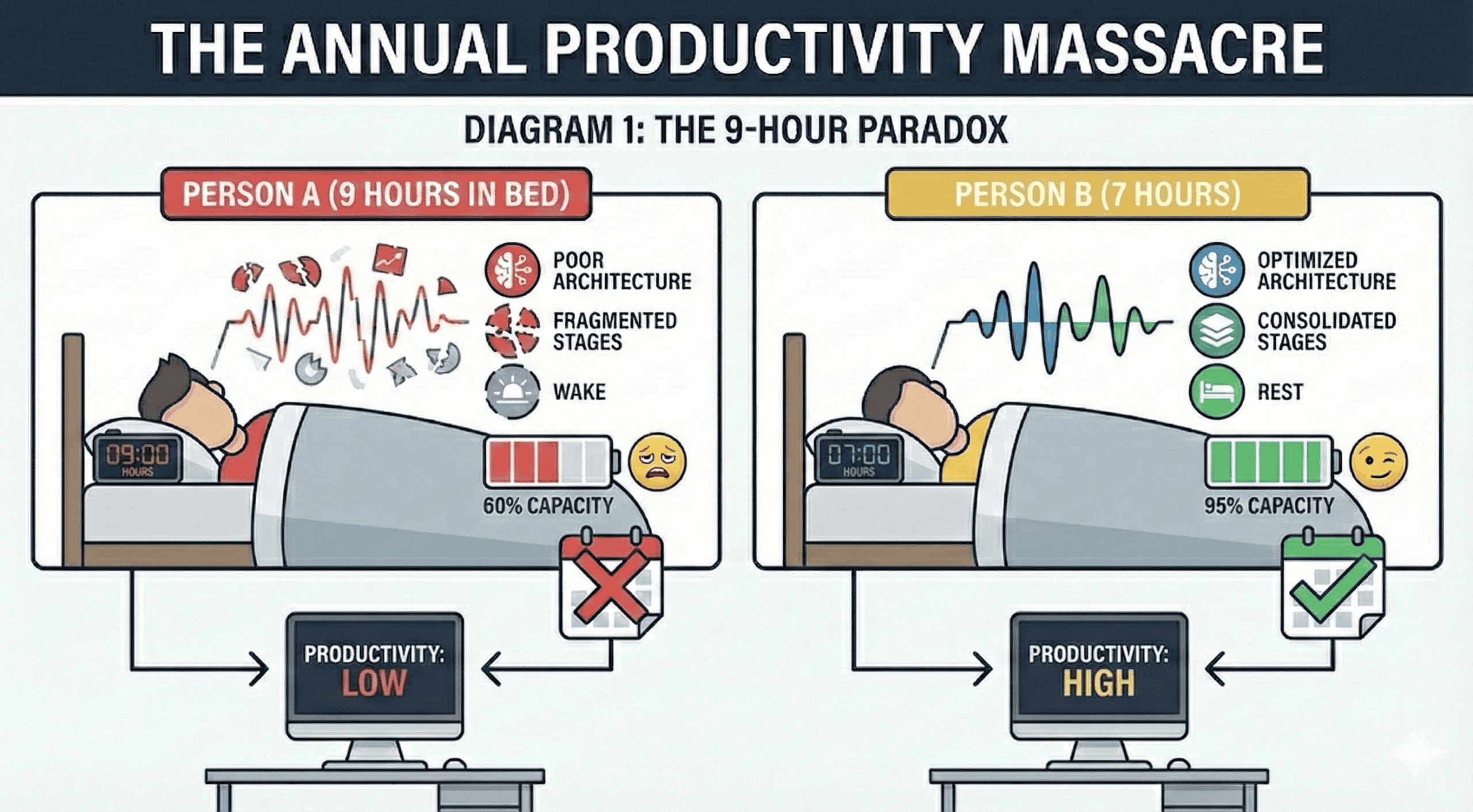 You can spend 9 hours in bed and wake up exhausted because your sleep architecture—the sequence and distribution of sleep stages—is degraded. Or you can spend 7 hours with optimized architecture and wake at 95% cognitive capacity.
