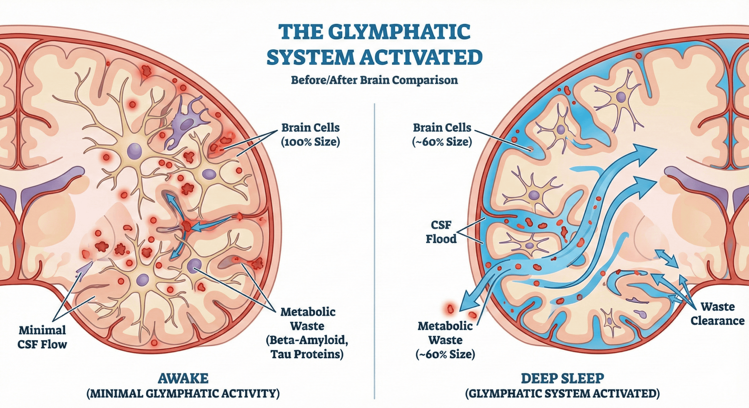 One of the most important discoveries in sleep neuroscience (2013). During Deep Sleep (N3), brain cells physically shrink by ~60%, allowing Cerebrospinal fluid (CSF) to flood the interstitial spaces.