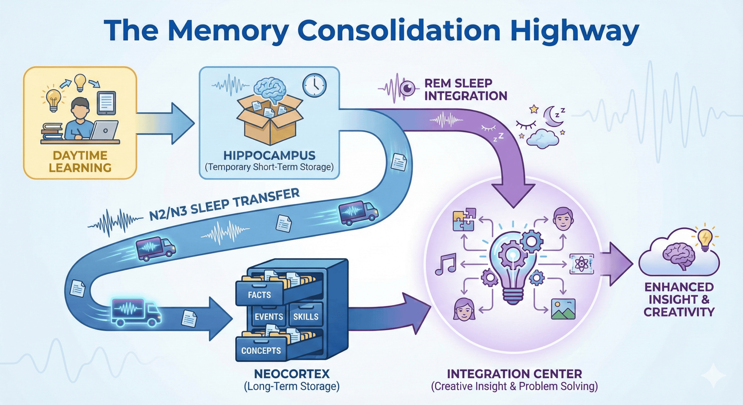Information is initially stored in the hippocampus (temporary RAM). During sleep, especially N2 Spindles and REM, this data is transferred to the neocortex (Hard Drive) for long-term storage.