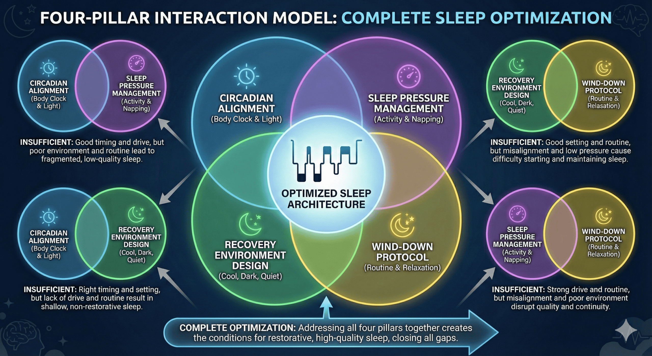 Sleep architecture doesn’t optimize by accident. It requires systematic engineering across four interconnected domains.