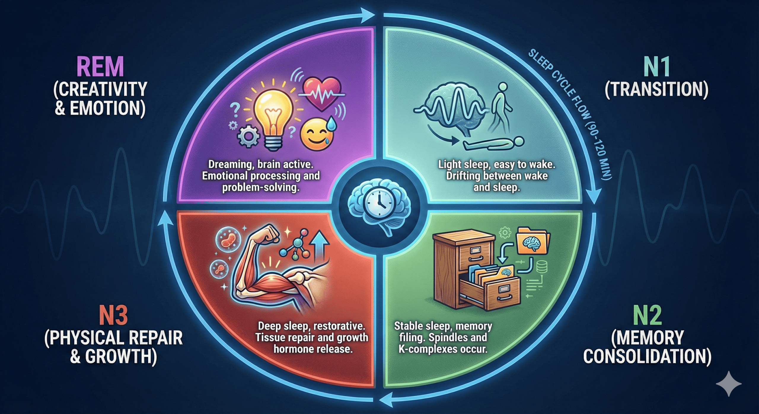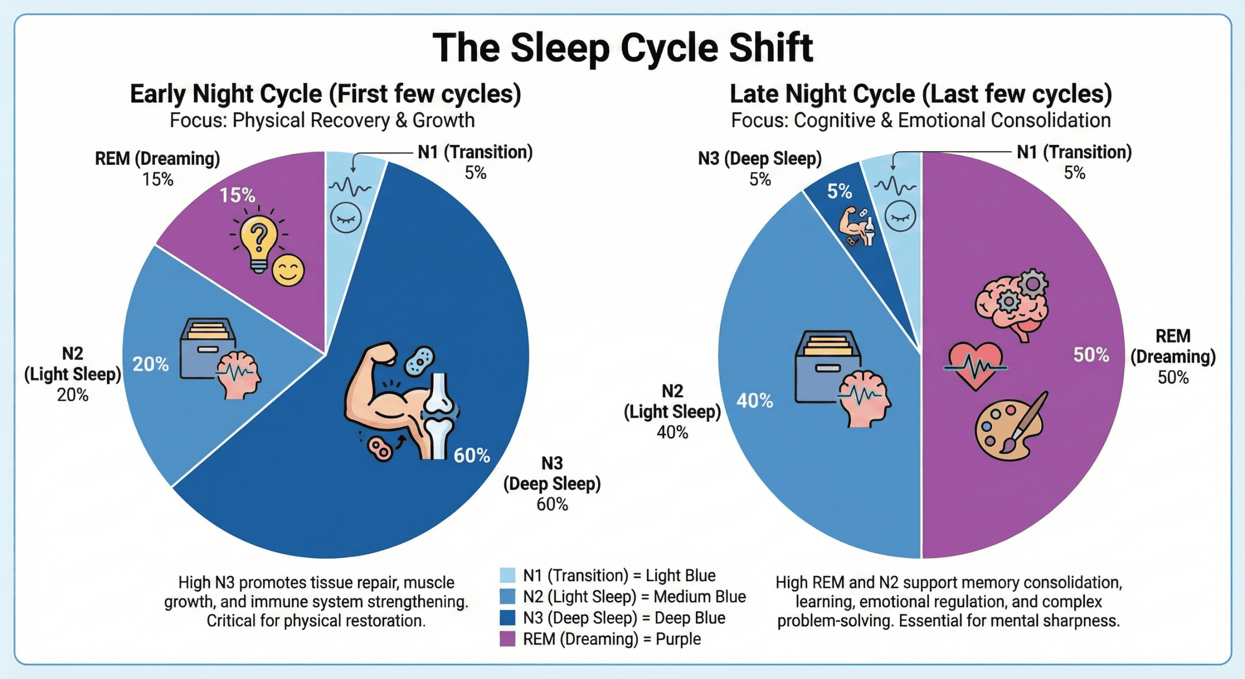 - Late Cycles (4-6): REM sleep dominates (Cognitive/Emotional Repair).