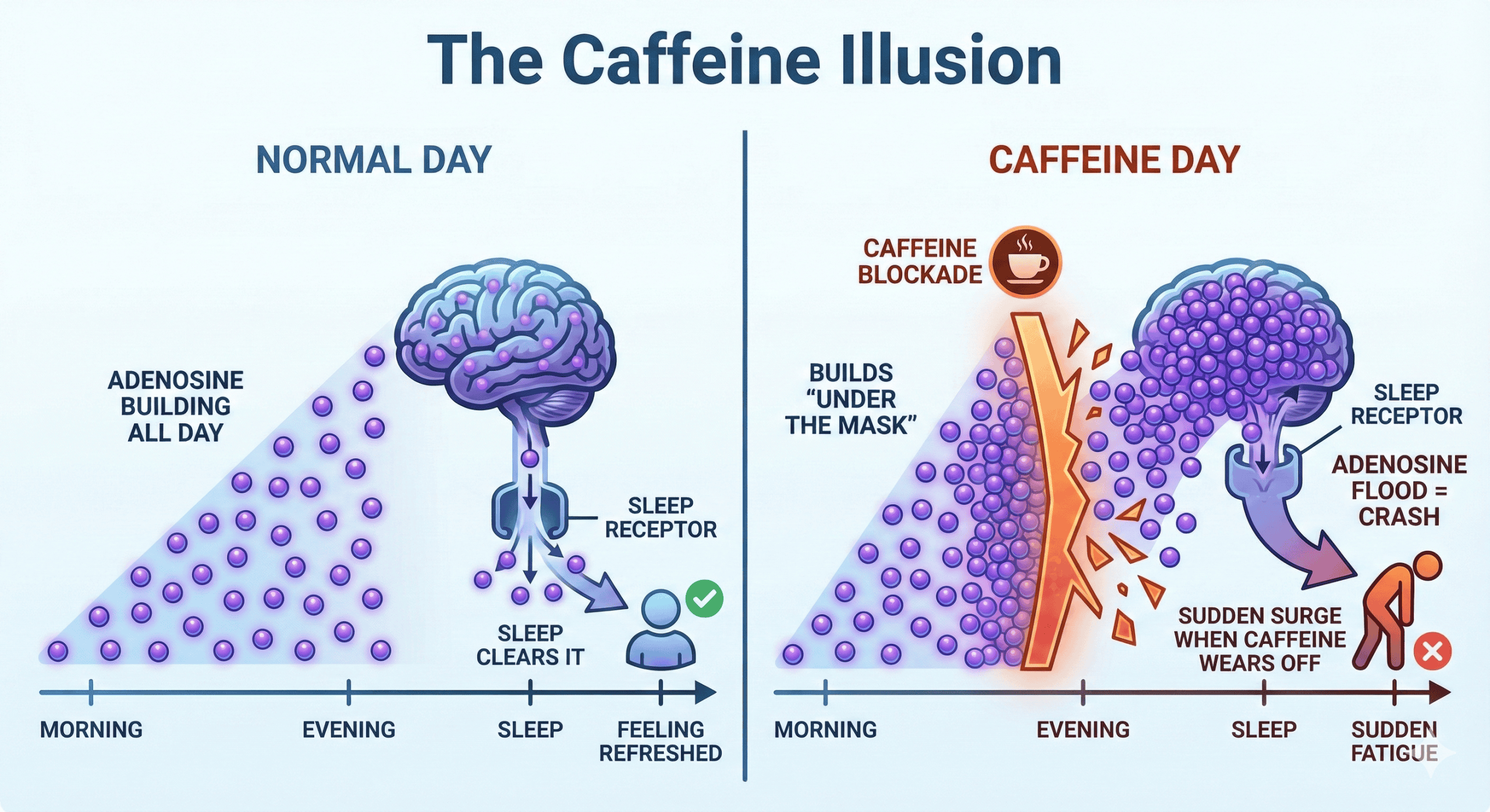 Hack: Caffeine blocks adenosine receptors, masking this pressure without clearing it.