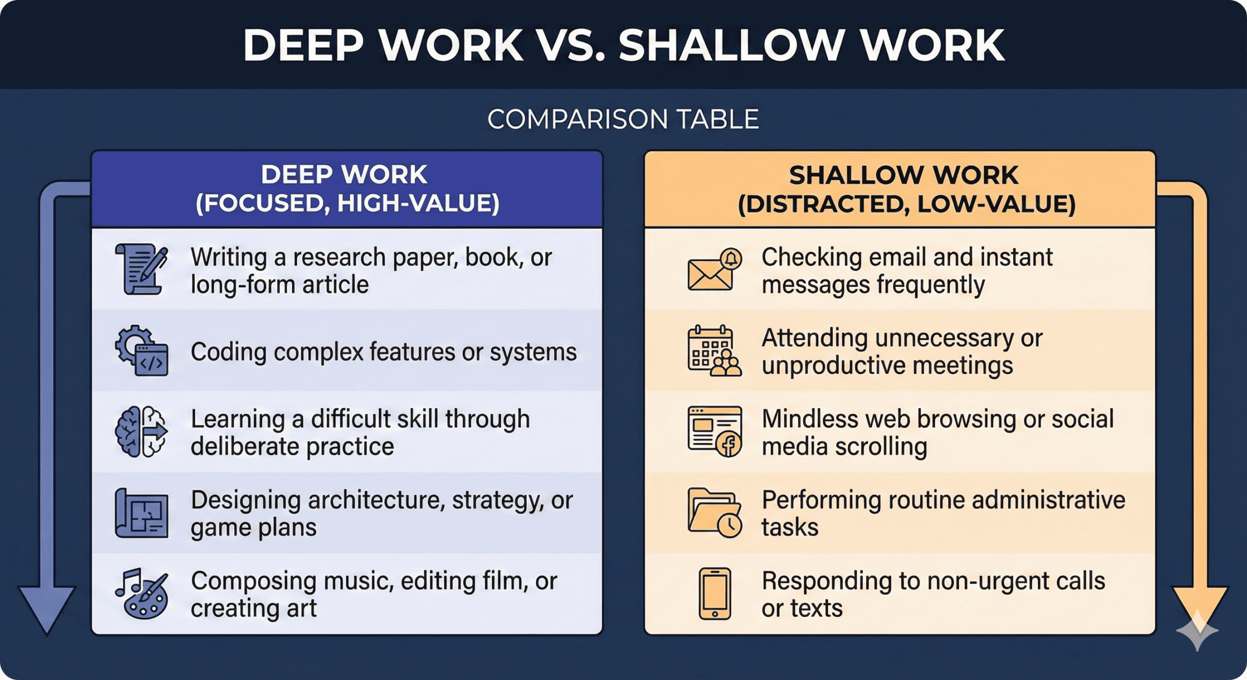 - Deep work creates the conditions — distraction-free, time-boxed, clearly defined blocks.
